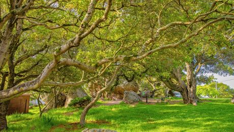 Great Stoneface Park is a quiet neighborhood park in Northbrae with street parking, walking trails, and an open grassy area. A shaded picnic table and benches offer peaceful spots to sit and take in the surroundings.