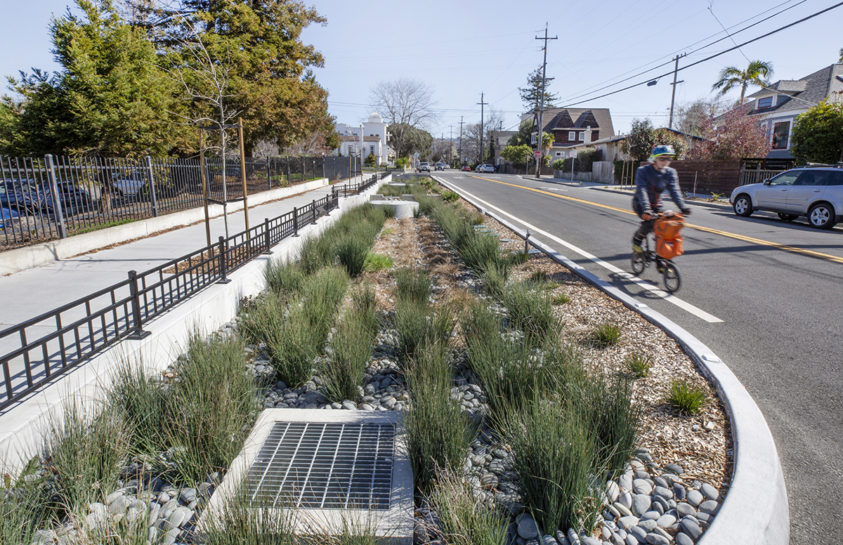 This project constructed green infrastructure facilities including bioswales and bioretention basins at various locations identified in the City’s Green Infrastructure Plan (GI Plan). The GI Plan was developed to provide a framework for identifying, implementing, tracking, and reporting green infrastructure (GI) projects across Berkeley in order to manage stormwater more sustainably and improve water quality.